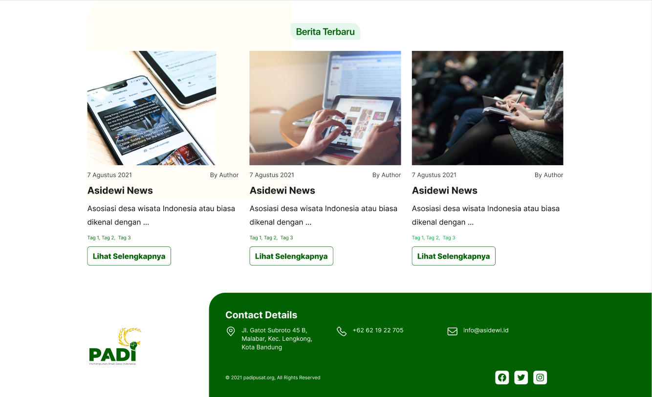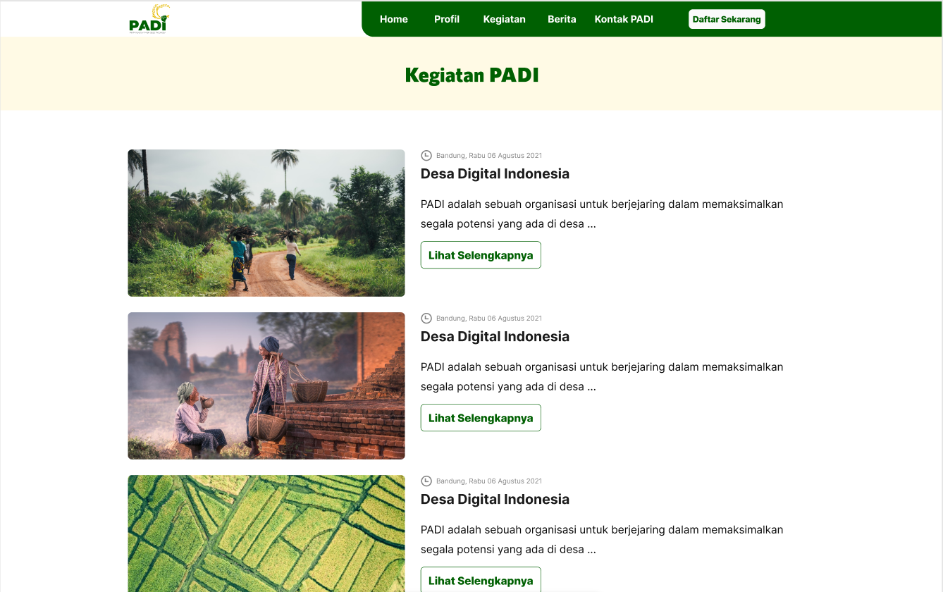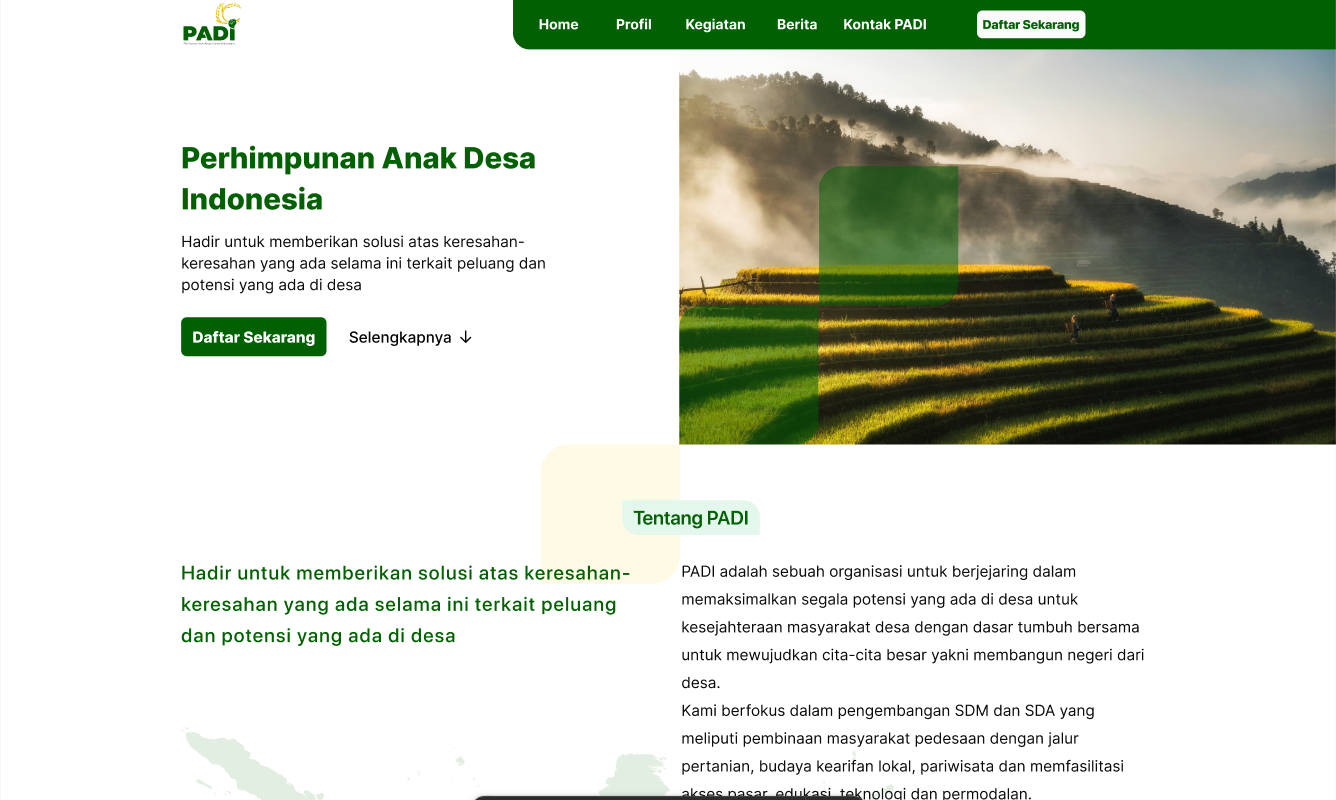 PADI adalah sebuah organisasi yang bertujuan untuk memaksimalkan segala potensi yang ada di desa guna meningkatkan kesejahteraan masyarakat desa. Berlandaskan prinsip tumbuh bersama, PADI berupaya mewujudkan cita-cita besar membangun negeri dari desa. Website ini dikembangkan menggunakan framework Laravel dengan dukungan database MySQL.