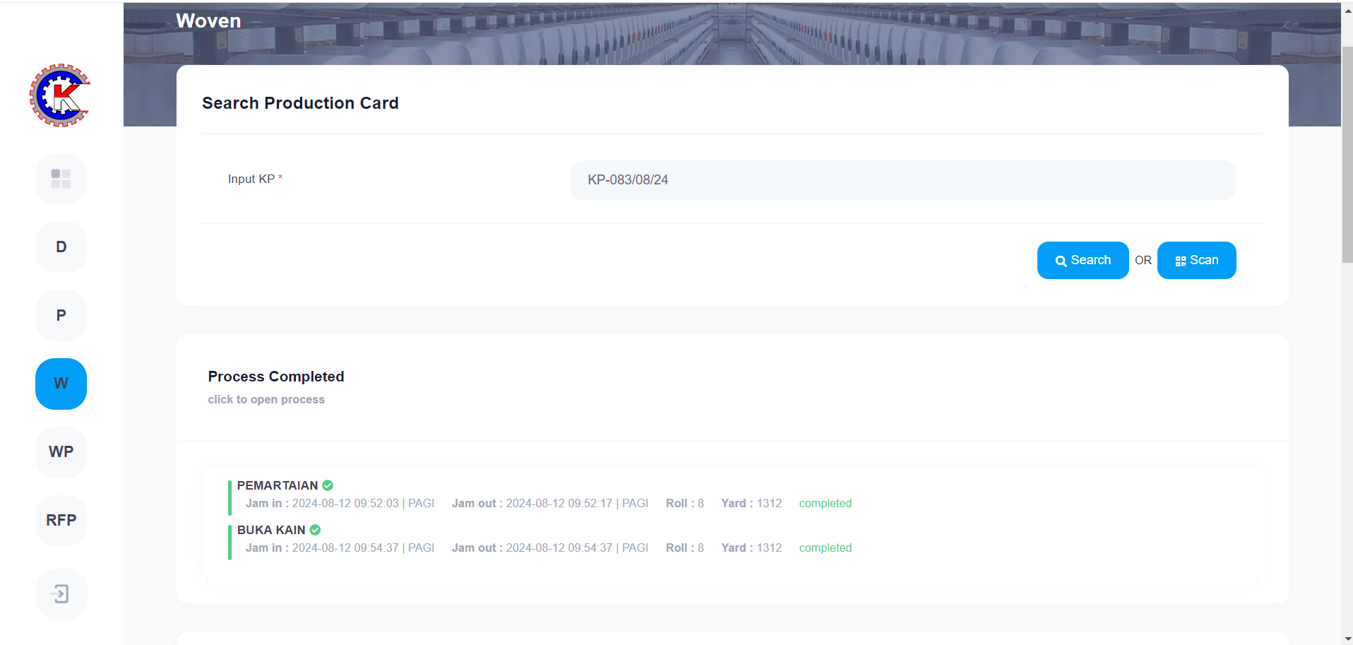 Program ini dirancang untuk memproses input pemartaan woven, di mana pengguna harus melakukan input pemartaan agar stok grey dapat berkurang sesuai kebutuhan. Prosesnya melibatkan setiap roll yang memiliki kode roll berbentuk QR Code, yang berisi informasi kode roll dan yard dari roll tersebut. Pengguna melakukan pemindaian QR Code menggunakan alat pemindai, kemudian program ini membaca kode roll tersebut dan memperbarui data di database untuk mengurangi stok grey woven.
