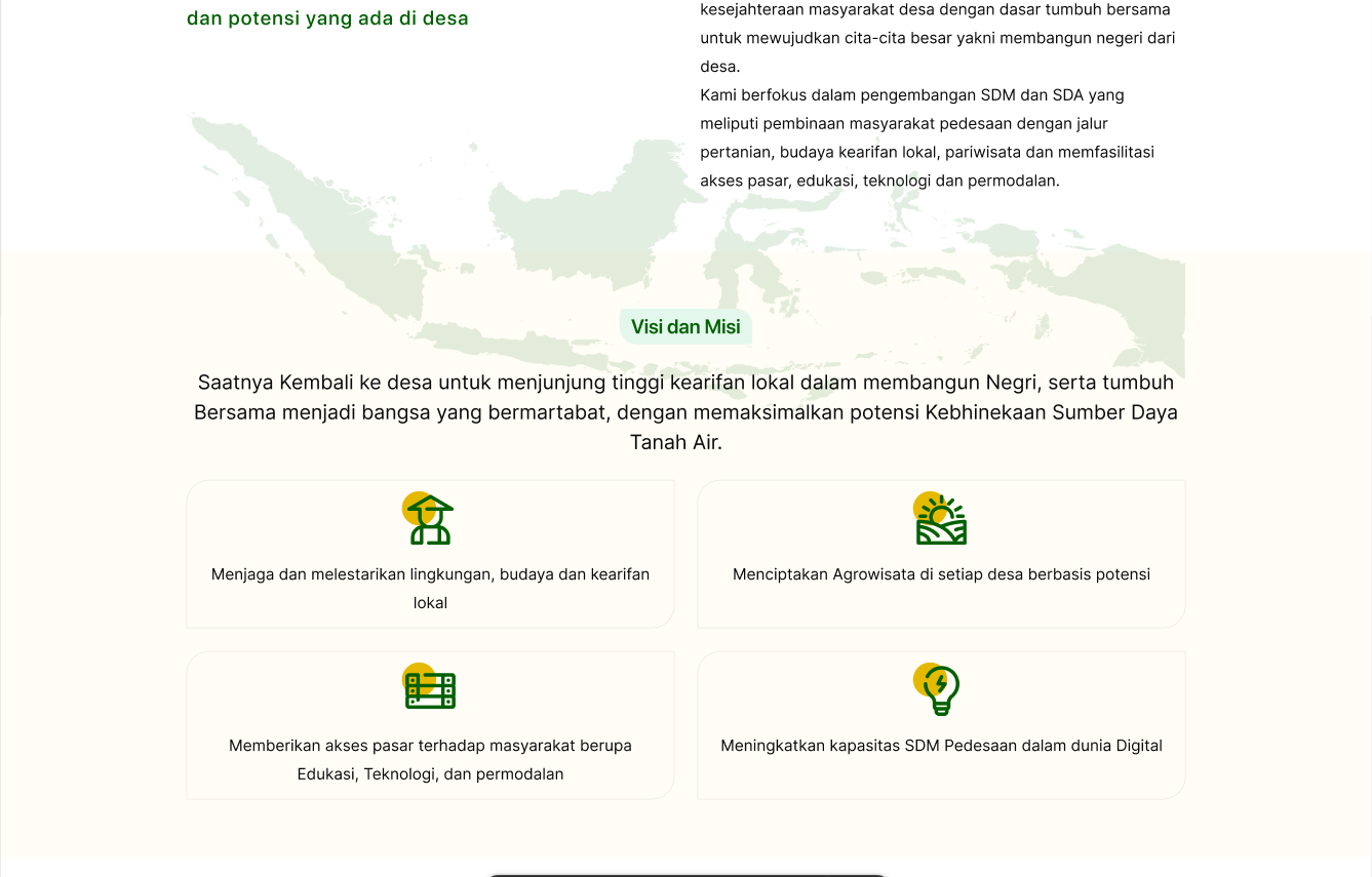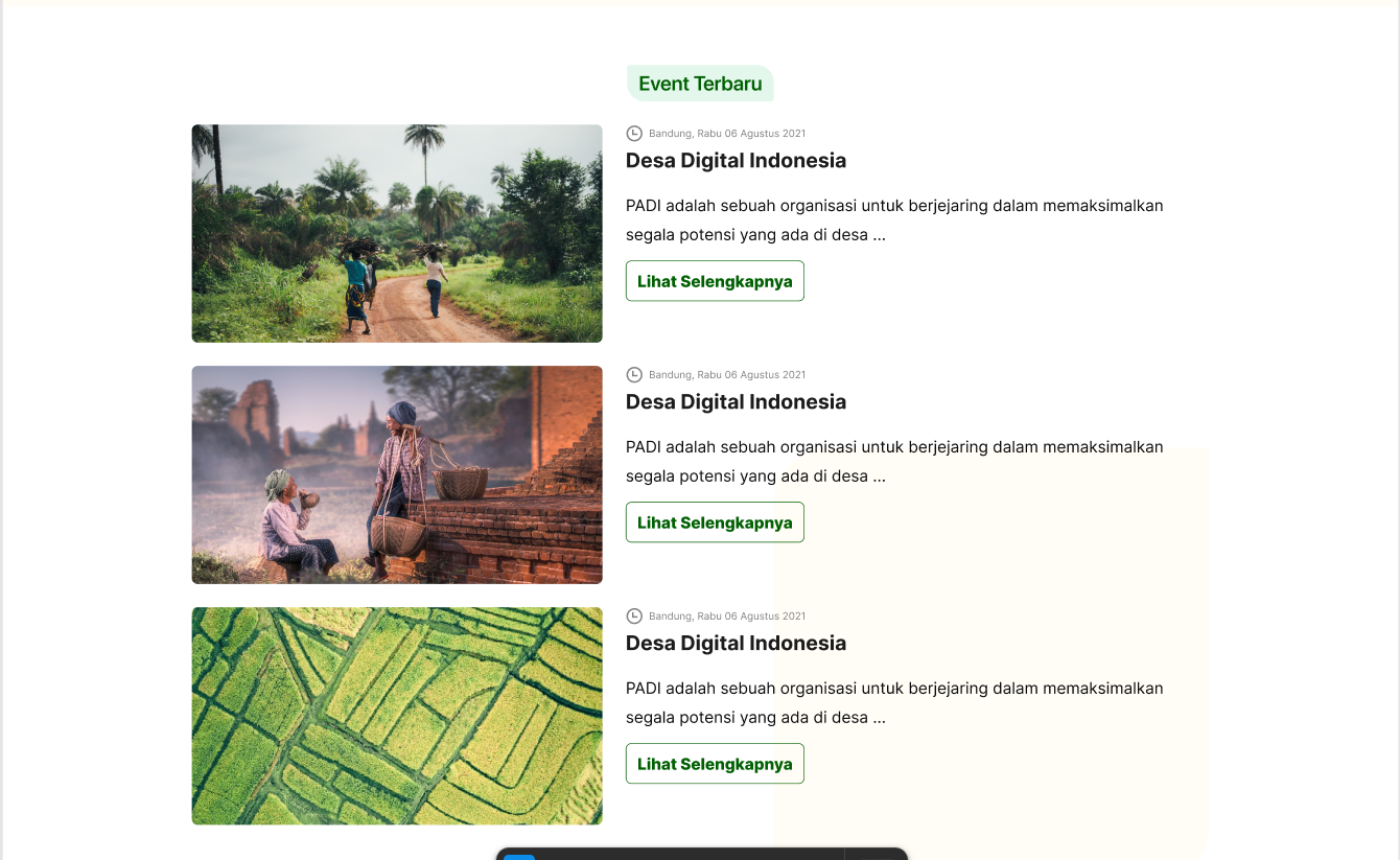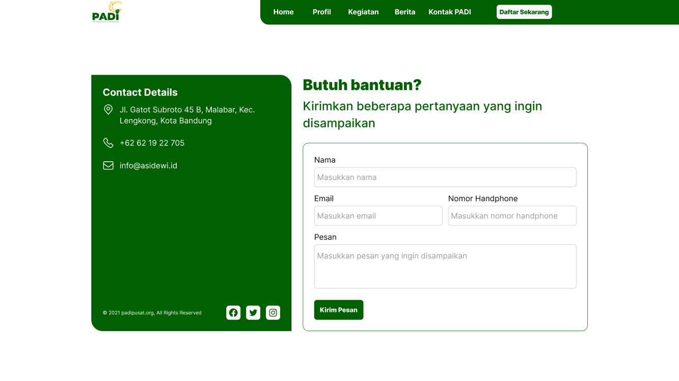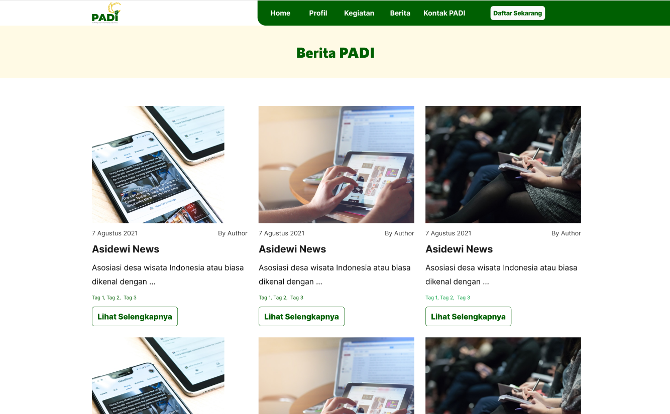 PADI adalah sebuah organisasi yang bertujuan untuk memaksimalkan segala potensi yang ada di desa guna meningkatkan kesejahteraan masyarakat desa. Berlandaskan prinsip tumbuh bersama, PADI berupaya mewujudkan cita-cita besar membangun negeri dari desa. Website ini dikembangkan menggunakan framework Laravel dengan dukungan database MySQL.