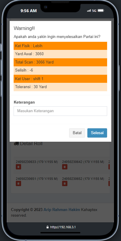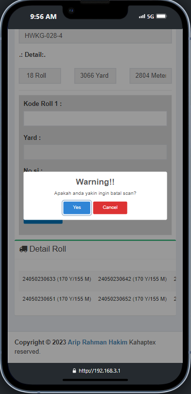Website ini merupakan aplikasi input produksi yang dikembangkan untuk PT Kahaptex Textile menggunakan framework CodeIgniter 3, dengan integrasi jQuery dan database MySQL. Fungsionalitas utama aplikasi ini memungkinkan pengguna untuk memindai QR Code pada setiap Kartu Produksi (KP) dan memulai proses input data. Setiap proses produksi terdiri dari dua tahap, yaitu start dan finish, di mana data ini digunakan oleh admin PPIC untuk memonitor waktu mulai dan selesai dari setiap proses produksi. Setiap KP memiliki tahapan proses yang berbeda, tergantung pada jenis kain yang diproduksi.