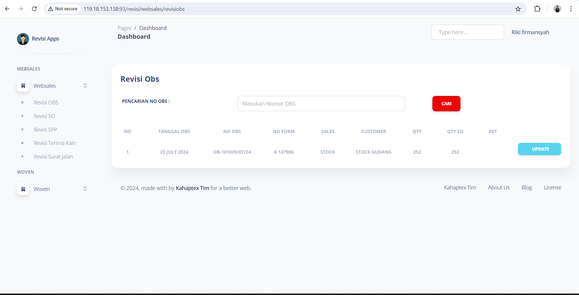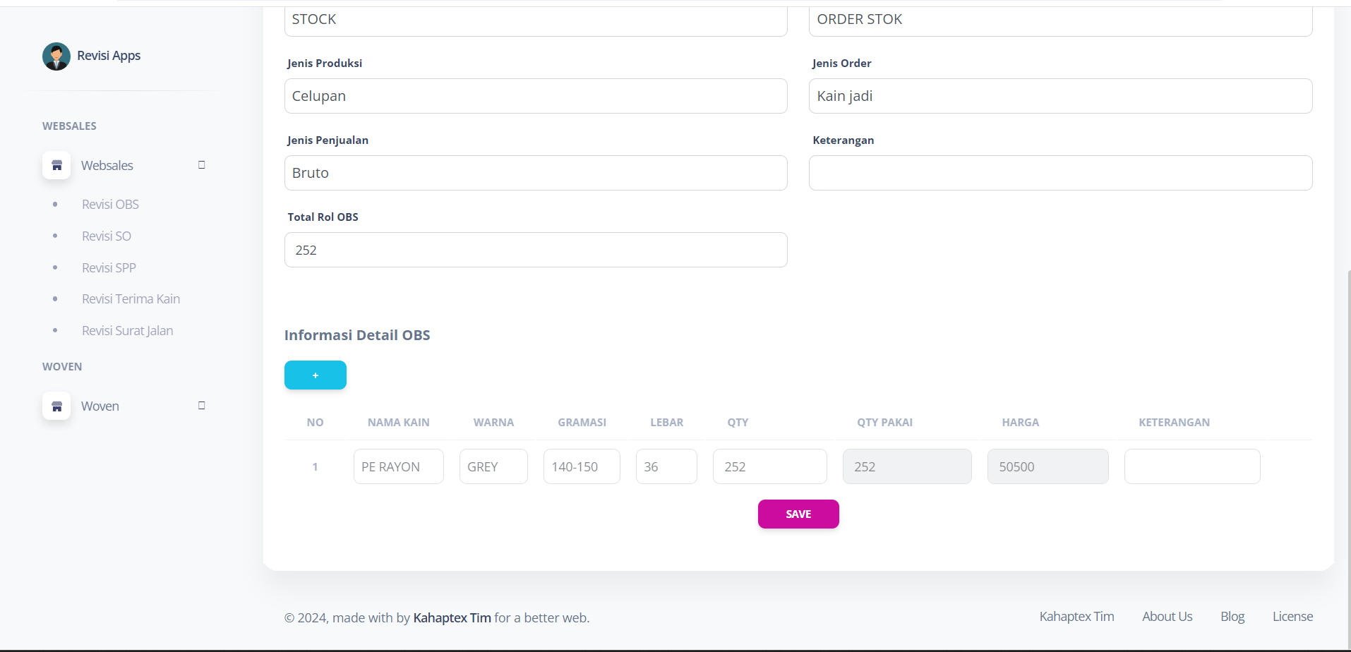 Program revisi ini dirancang untuk memfasilitasi perubahan data terkait pemesanan di PT Kahaptex Textile, baik itu koreksi input data, perubahan kuantitas, atau permintaan revisi lainnya. Aplikasi ini memungkinkan pengguna untuk melakukan revisi secara langsung melalui sistem, memberikan fleksibilitas dalam mengelola data pemesanan. Program ini dibangun menggunakan framework CodeIgniter 3, dipadukan dengan jQuery, dan didukung oleh database MySQL.